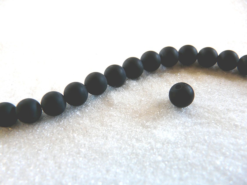 Des petites agates toutes noires, mates et rondes, à l'aspect givré, dépoli. Un magnifique rendu avec d'autres perles très brillantes pour un effet contrasté.