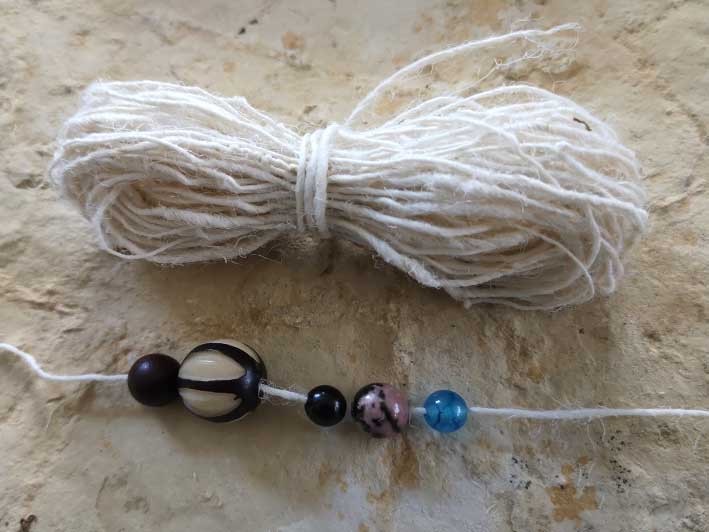 Il est possible d'enfiler des perles sur ce fil, les choisir avec un trou assez grand. Les perles en bois sont très adaptées pour leur enfilage facile.