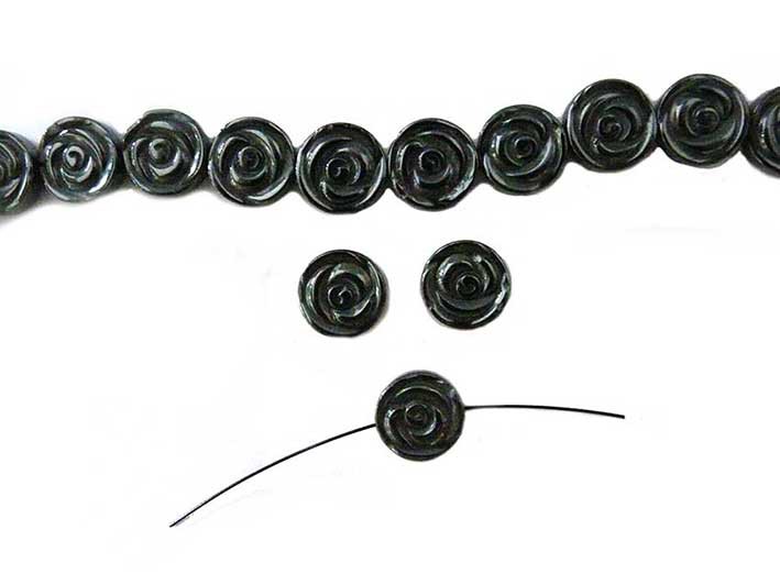 Perle plate à décor de rose en Hématite noire