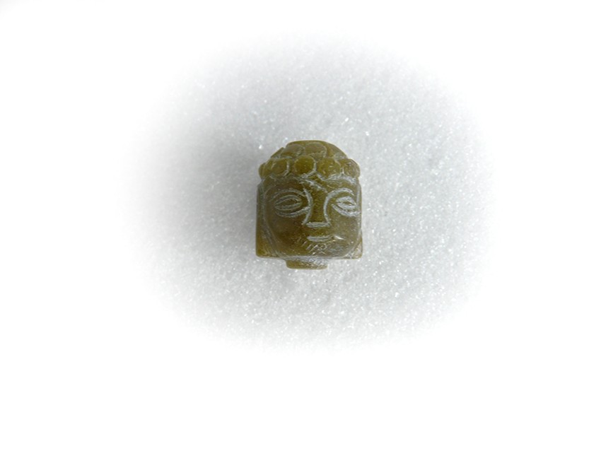 Tête en jade sculpté sur toute sa surface. Traits bien dessinée et chevelure sculptée à l'arrière