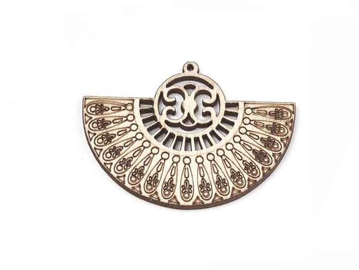 - Grand pendentif éventail en bois non teinté et pyrogravé.