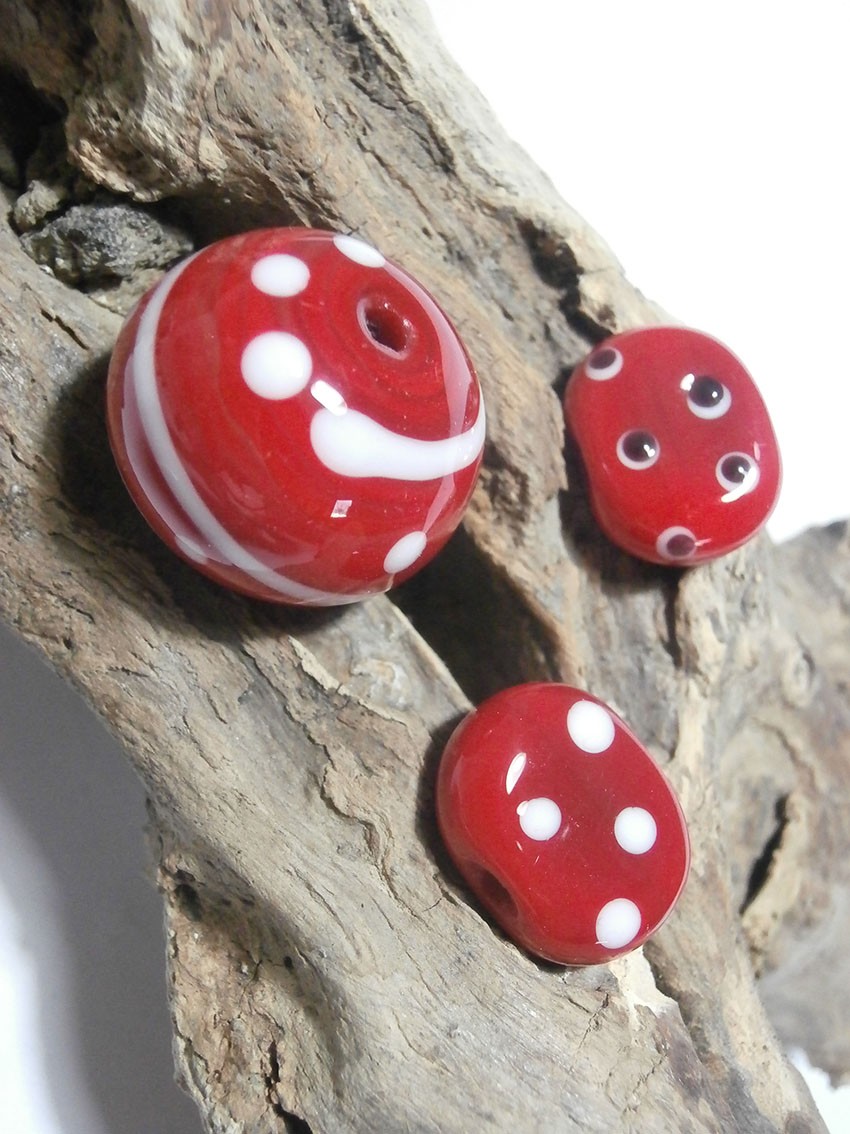 Lot 3 perles rouge à points et spirales. 1 grosse perle ronde 22x18mm avec spirale et points blancs