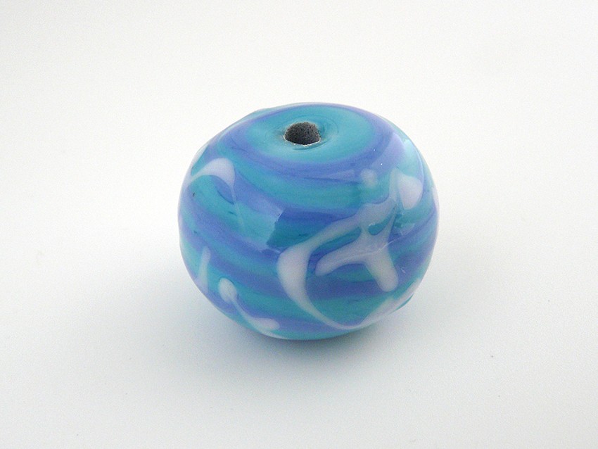 Perle en verre soufflée dans les tons bleu-vert, avec rehaut de blanc.