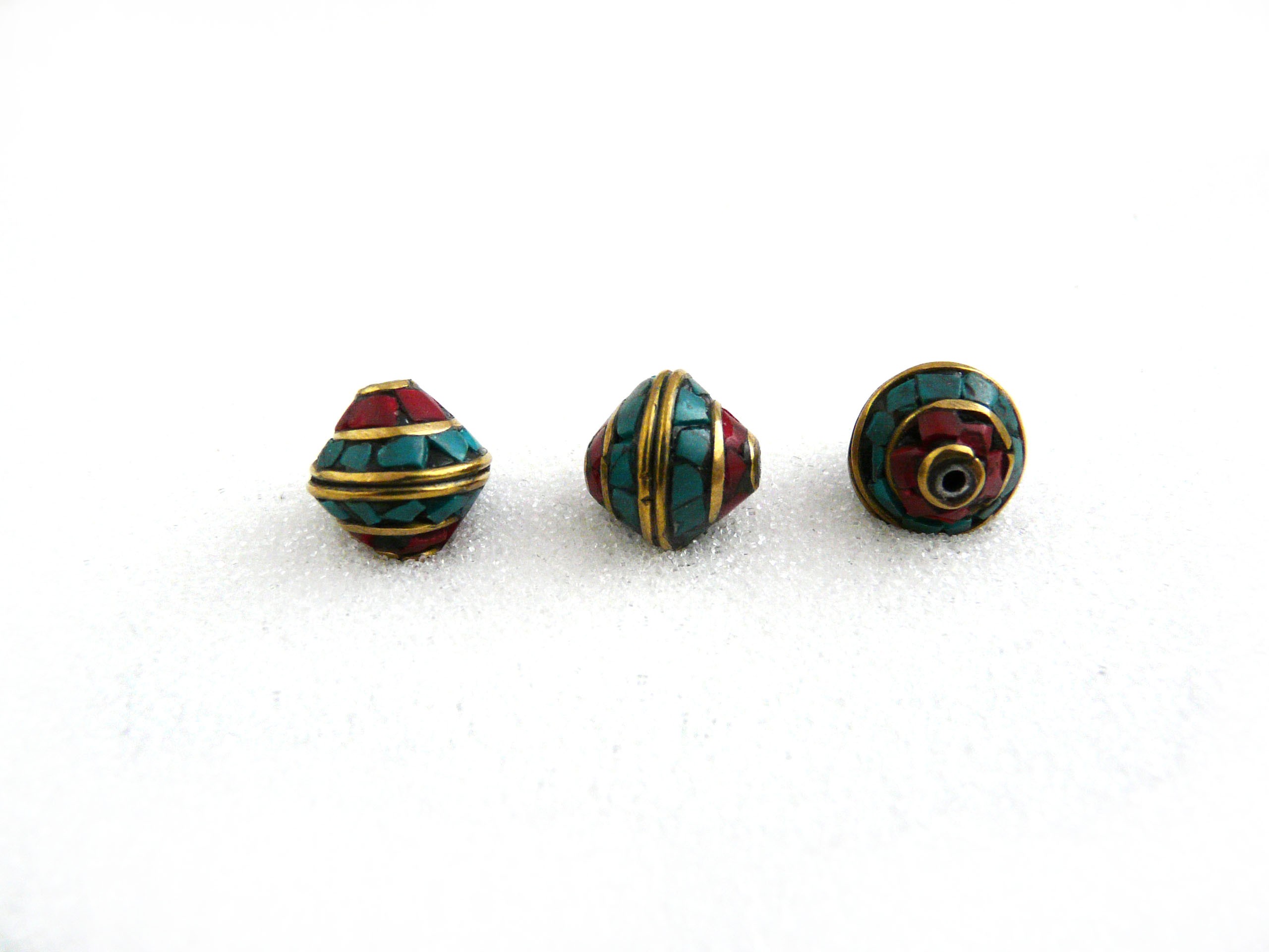 Perle tibétaine bicone 12 x12mm turquoise-corail sur laiton x1