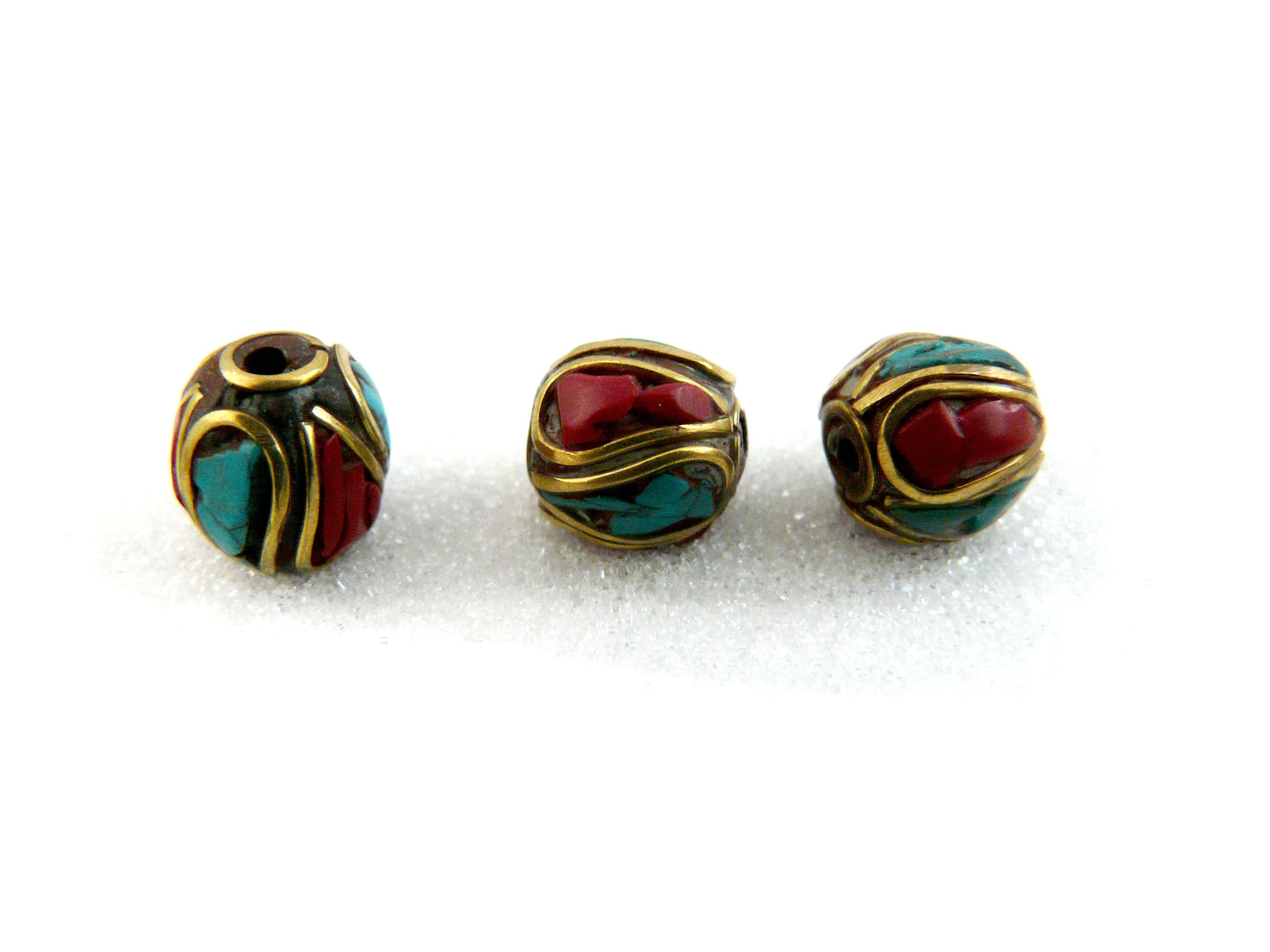 Perle composée de fragments de turquoise et de corail marquetés sur du laiton.