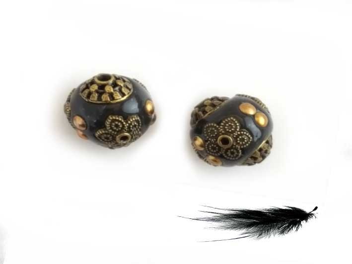 Perle ronde modelée à la main, décorée d'éléments en métal bronze doré