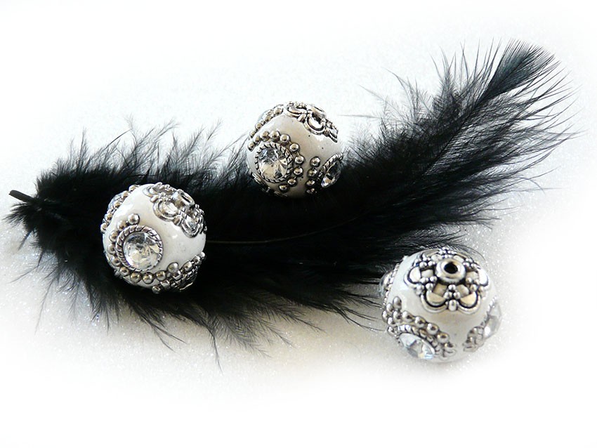 Perle ronde modelée à la main , décorée d'éléments en métal et de strass blancs