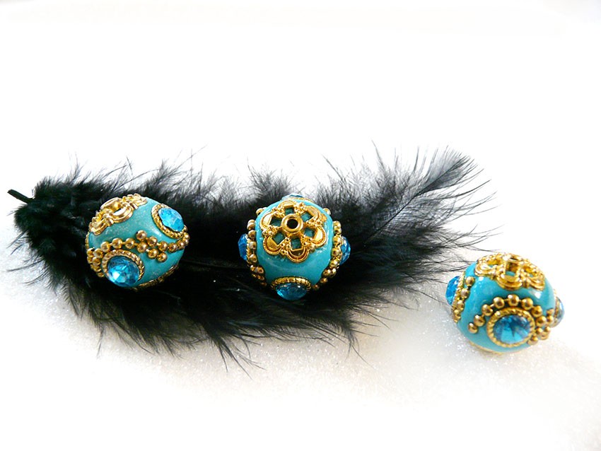 Perle ronde modelée à la main , décorée d'éléments en métal et de strass bleus