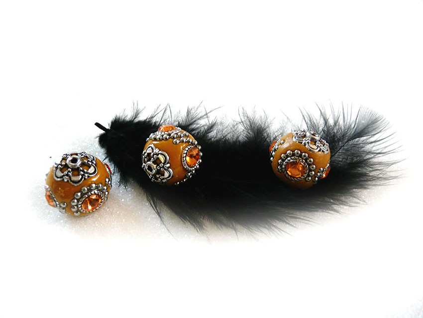 Perle ronde modelée à la main , décorée d'éléments en métal et de strass orange