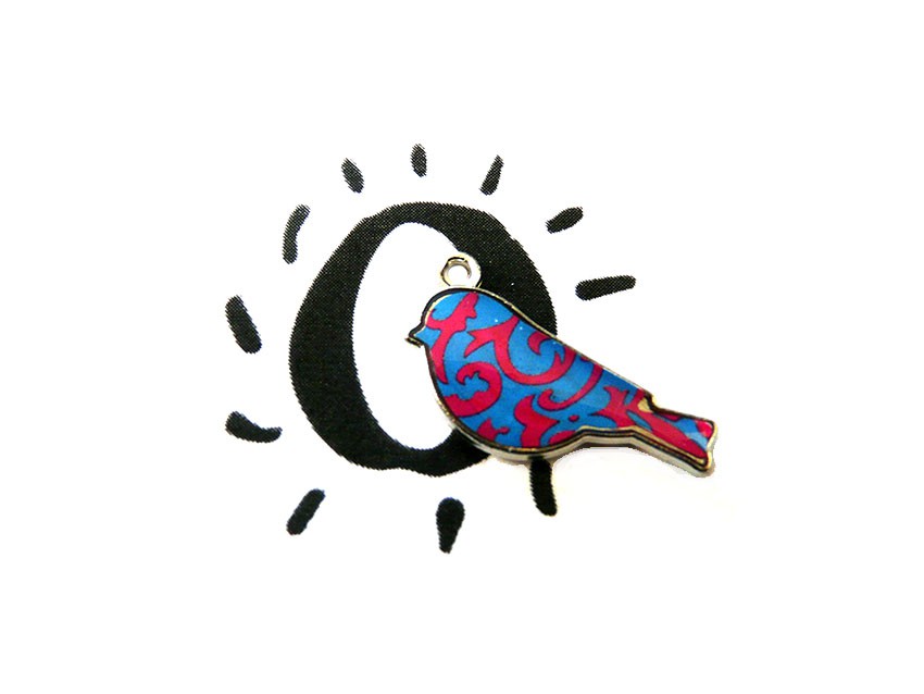 1 Breloque oiseau bleu à décor de volutes de couleur rose en métal recouvert de résine