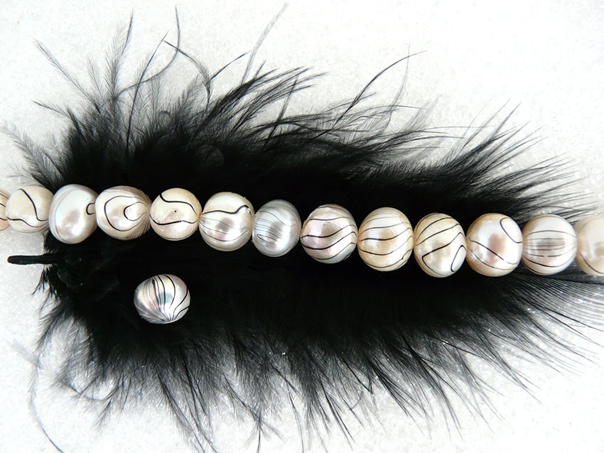 Perles pas totalement rondes, rayées de noir sur teint crème.