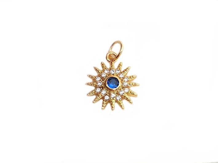 Pendentif soleil-fleur 13mm avec zircons -Bleu-Doré 18K x1