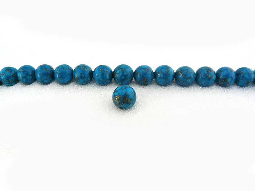 15 perles veinées reconstituées de fragments de turquoise chinoise (calcite ou quartz) teintés.